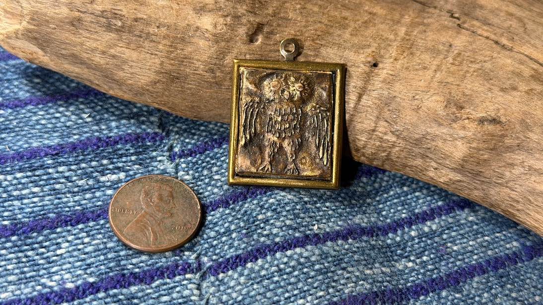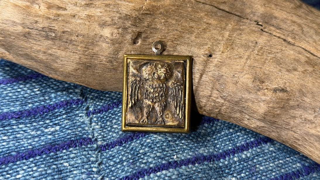 Andrew started by creating molds of these antique pendants and then pressed out the polymer clay from each one. He then sculpted in extra details not present in the original pendants, antiqued the polymer, added a light gold wash, and sealed them before affixing them to the bezels.